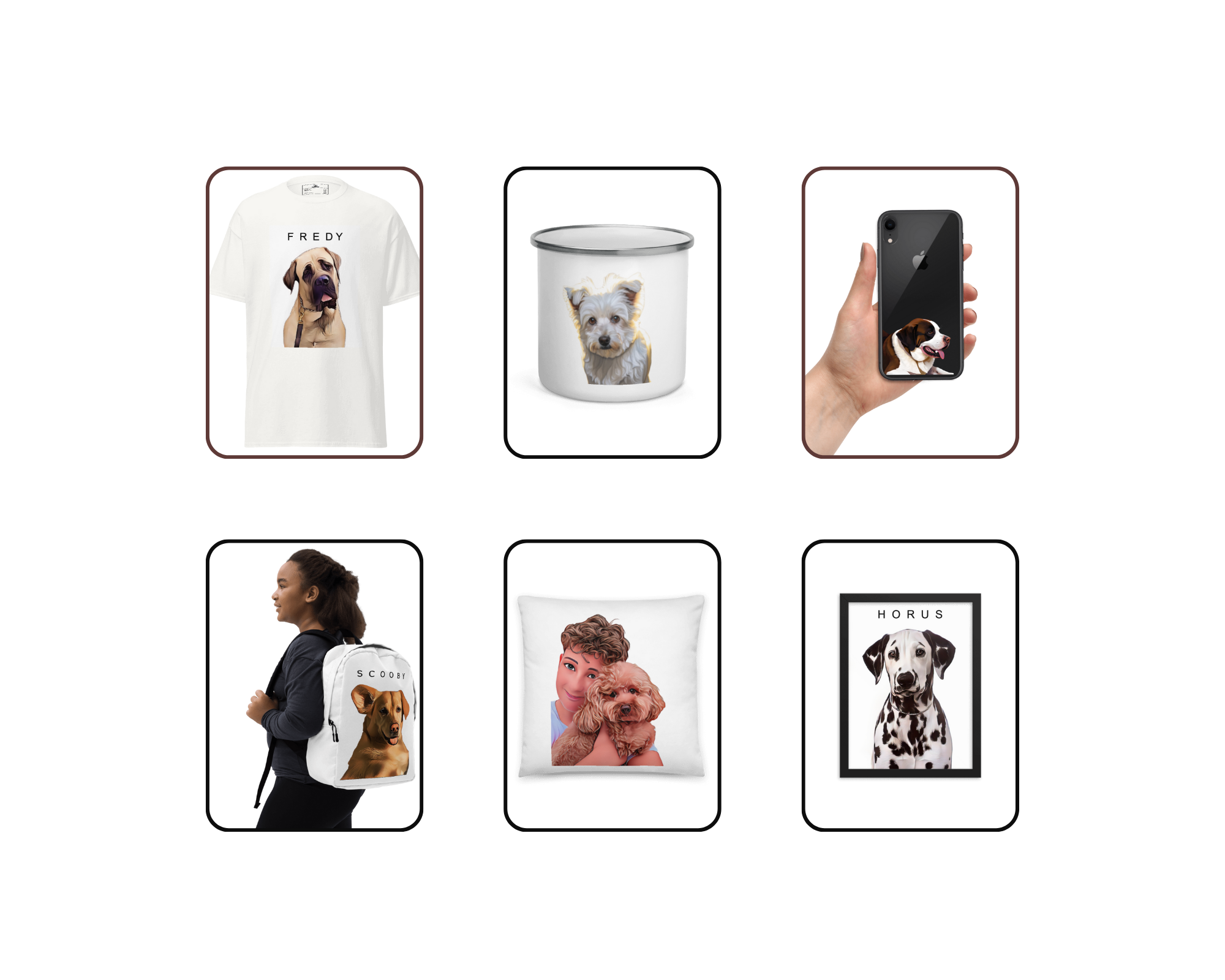 Lleva tu mascota a todas partes con nuestra gama de productos personalizados. Desde mochilas y fundas de móvil hasta camisetas, nuestras ilustraciones detalladas de mascotas asegurando que tu mascota esté siempre contigo, dondequiera que vayas.